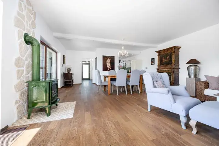 • prostorný obývací pokoj s krbovými kamny se vstupem na terasu