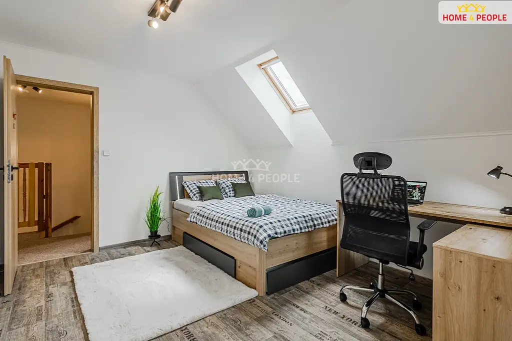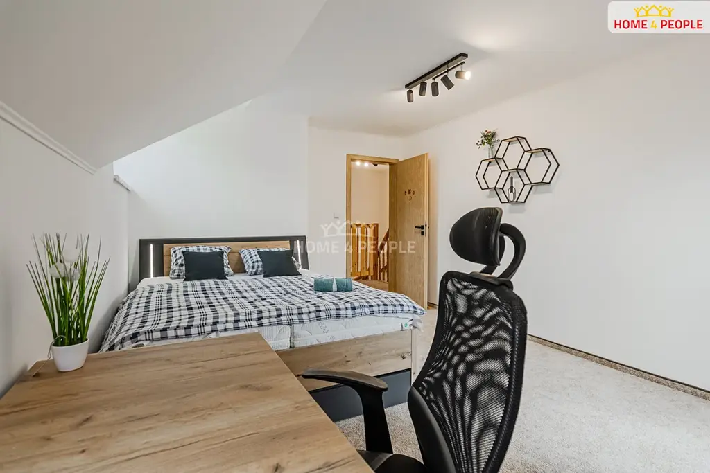Kuchyně je plně vybavena moderními spotřebiči (myčka, trouba, sklokeramická deska) a navazuje na prostorný jídelní kout ideální pro rodinná setkání. V přízemí se dále nachází koupelna se sprchovým koutem, pracovna s kancelářským nábytkem pro pohodlnou práci z domova a praktická komora s přípojkou na pračku a sušičku.
