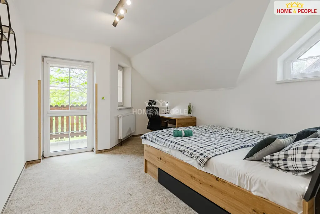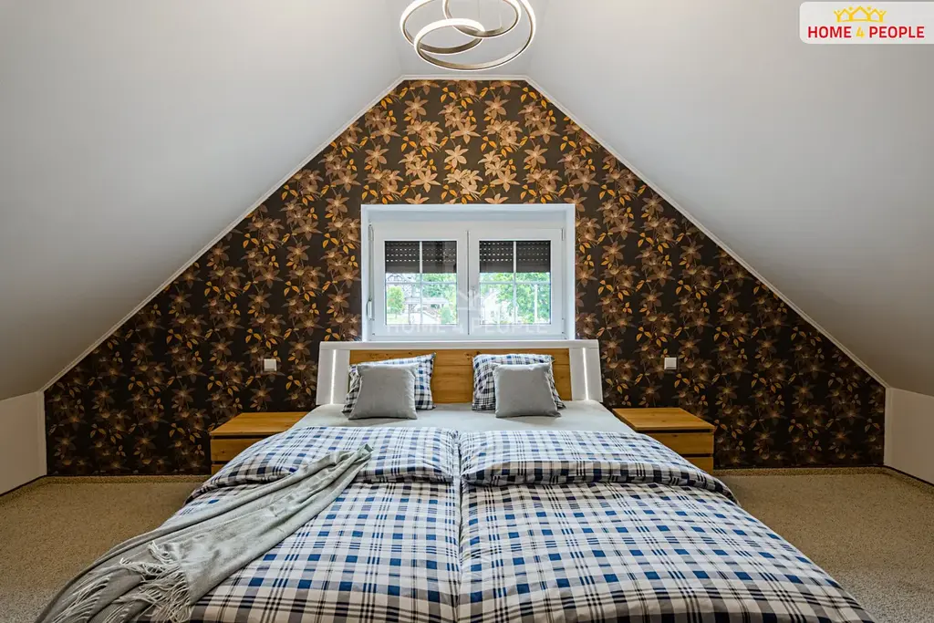 V patře najdete tři samostatné pokoje, z nichž dva mají psací stůl. Nechybí zde ani prostorná šatna a druhá koupelna s rohovou vanou, bidetem a toaletou. Ze dvou pokojů je přímý vstup na velký balkón. Většina oken je opatřena předokenními roletami.