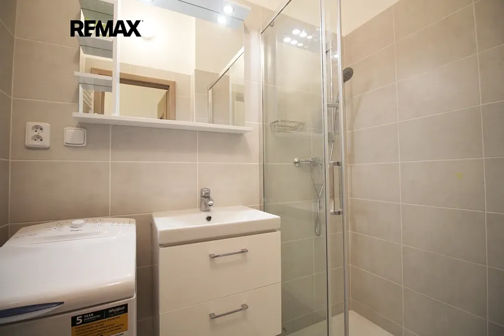 Dále je v bytě koupelna s velkým sprchovým koutem, toaleta je samostatná místnost s oknem a umývátkem.