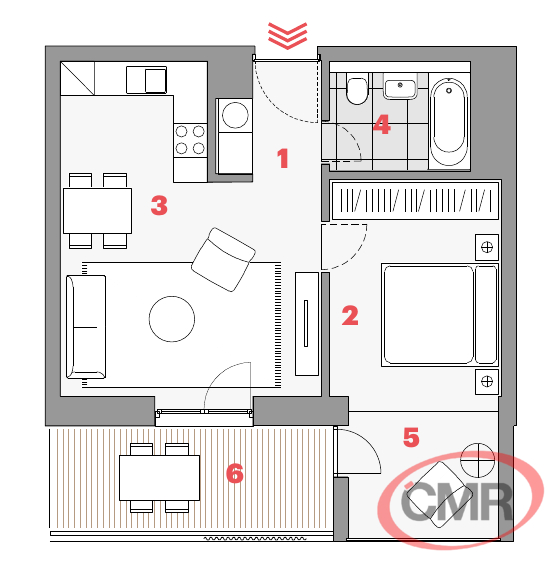 Dispozice bytu nabízí komfortní a praktické uspořádání. Obývací pokoj s kuchyňským koutem o velikosti 23 m² tvoří hlavní obytný prostor a navazuje na prostornou lodžii o velikosti 10 m² s jihozápadní orientací, která poskytuje ideální místo pro odpočinek nebo posezení. Samostatná ložnice o velikosti 18 m² nabízí dostatek prostoru nejen pro spaní, ale i případný pracovní kout. Kuchyňská linka je vybavena vestavěnými spotřebiči, konkrétně troubou, sklokeramickou varnou deskou, digestoří a lednicí. Byt je částečně zařízený a připravený k okamžitému nastěhování.