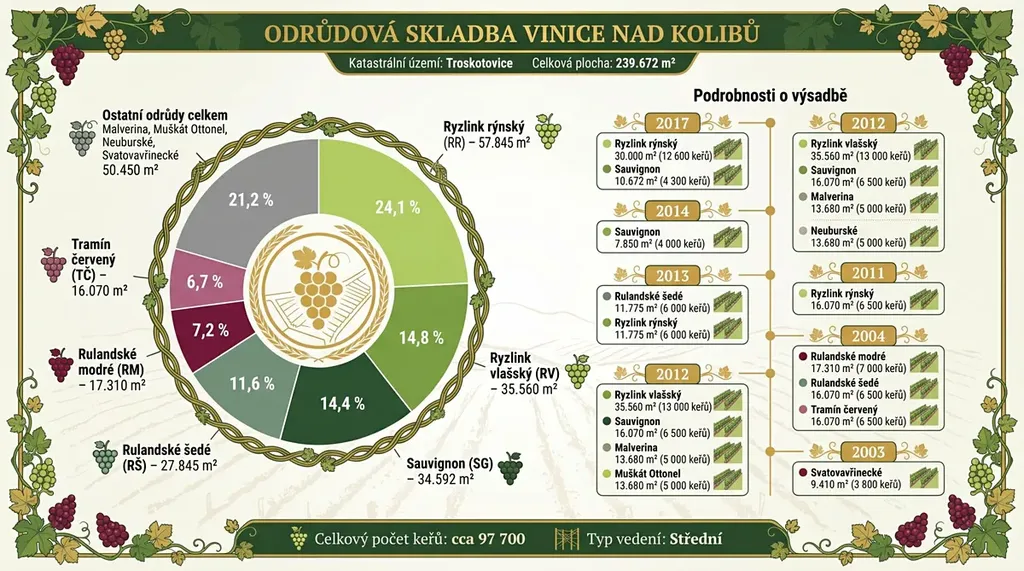 Vinice disponuje bohatou skladbou odrůd s celkovým počtem přibližně 97 700 keřů.. Výsadba probíhala postupně v letech 2003 až 2017.