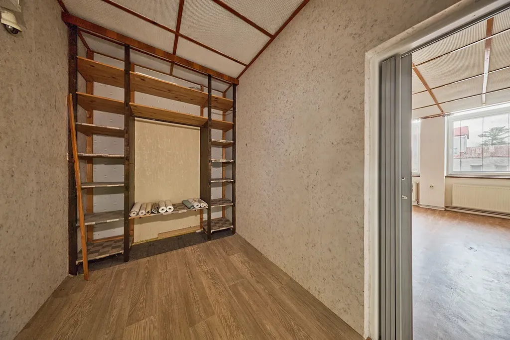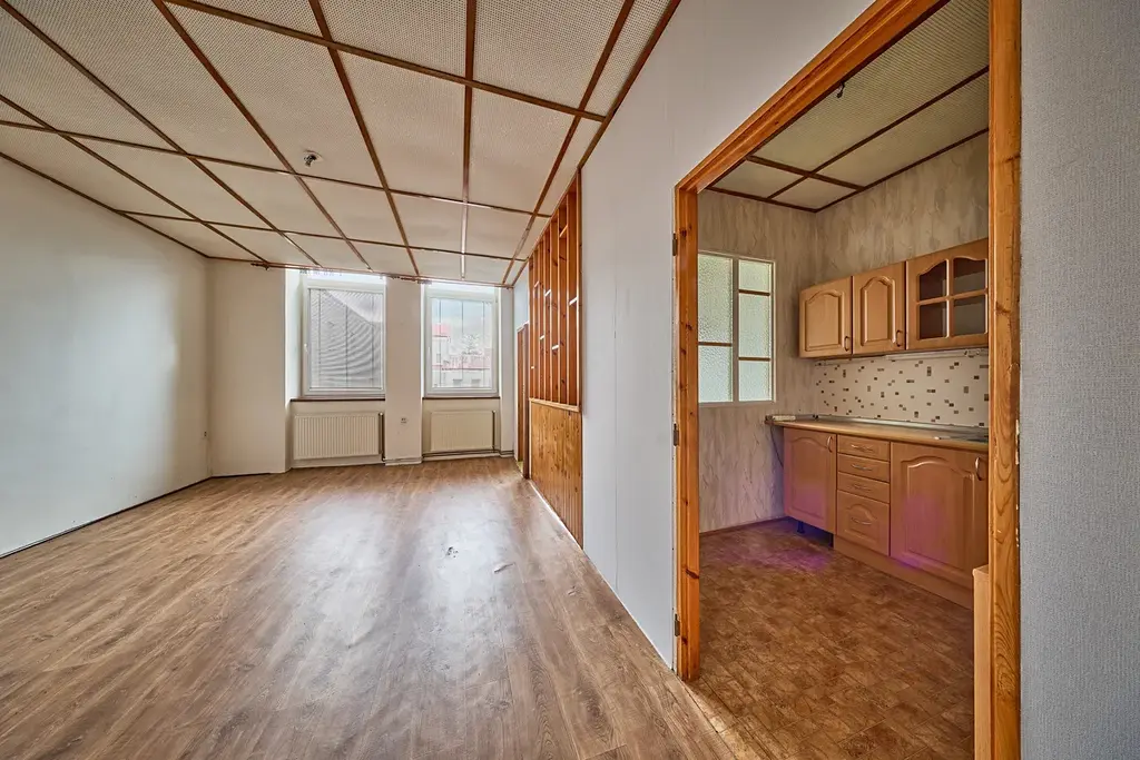 Plocha bytu je 42m2, přičemž předsíň má 6,8m2 a je ideální k umístění vestavěné skříně nebo vybudování šatny, koupelna vč. WC 4,9m2, dále prostorný obývací pokoj 21m2, malá kuchyň 4,8m2 a ložnice 6,7m2. Jednotlivé místnosti jsou oddělené dřevěnými přepážkami. Byt má vysoké stropy, které jsou v současné době snížené stropními deskami. Možné využití například na vybudování patra na spaní. Obytné místnosti mají jako podlahovou krytinu parkety, ale nyní jsou zakryté PVC. V bytě jsou instalovaná plastová okna s trojsklem.