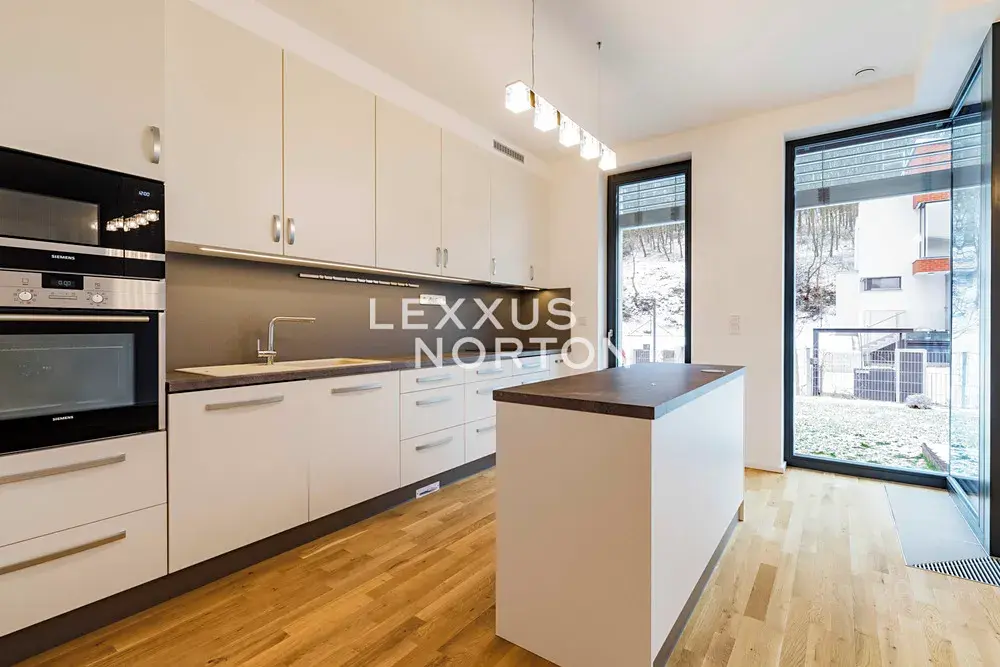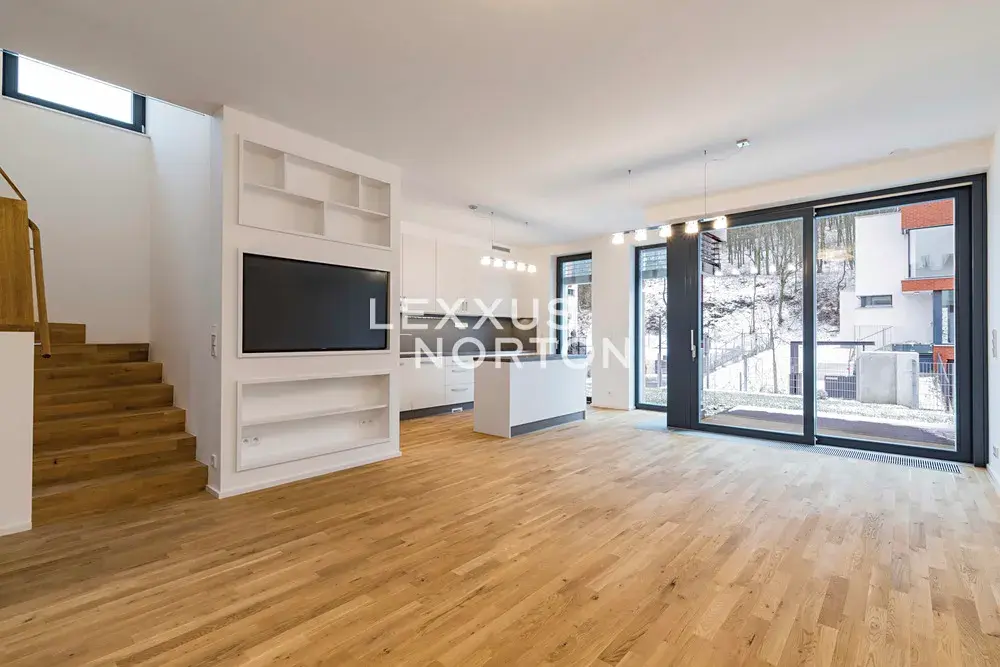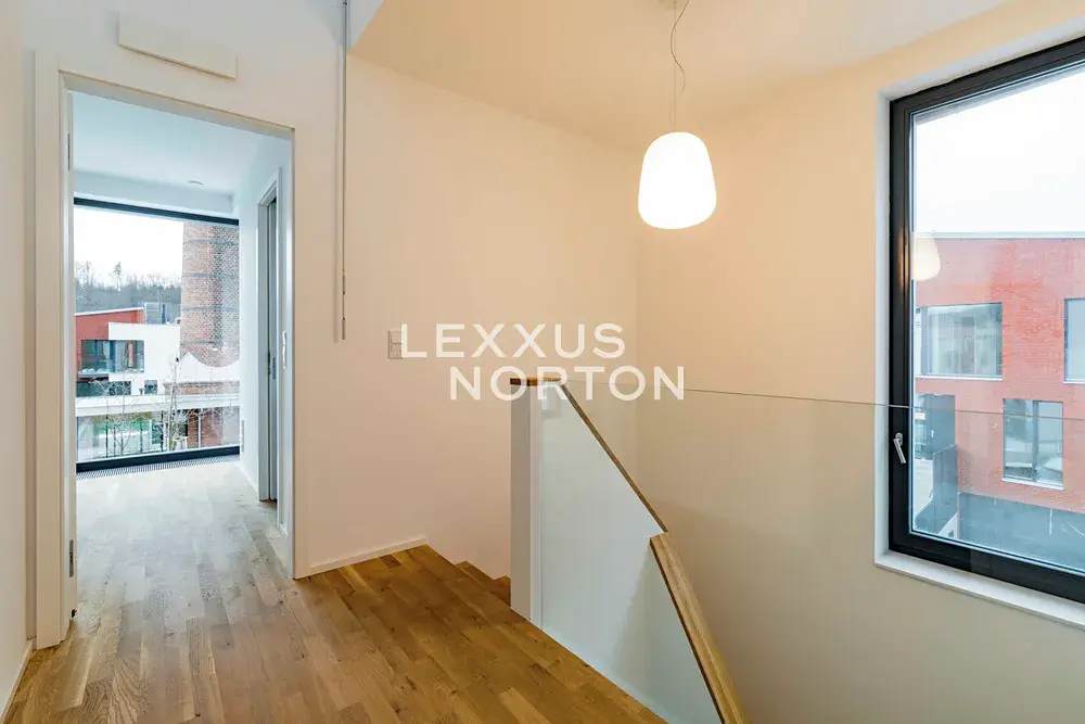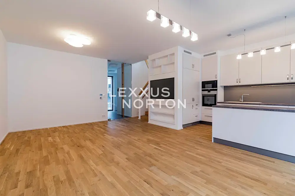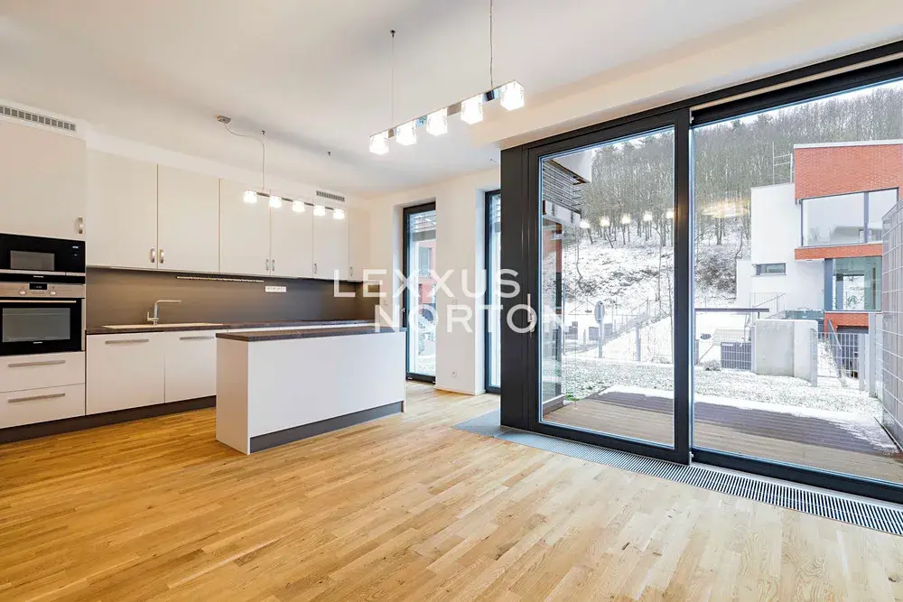 Dispozice domu zahrnuje prostornou vstupní halu, vzdušný obývací pokoj propojený s jídelnou a plně vybaveným moderním kuchyňským koutem, čtyři ložnice, tři koupelny, šatnu, prádelnu, fitness místnost a technické zázemí. K domu náleží také balkon, terasa se zahradou a dvě garážová parkovací stání.