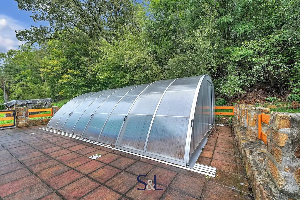 - Zahrada a relax: Udržovaná zahrada, teráska s elektrickým zastřešením a krytý venkovní bazén s vyhříváním.