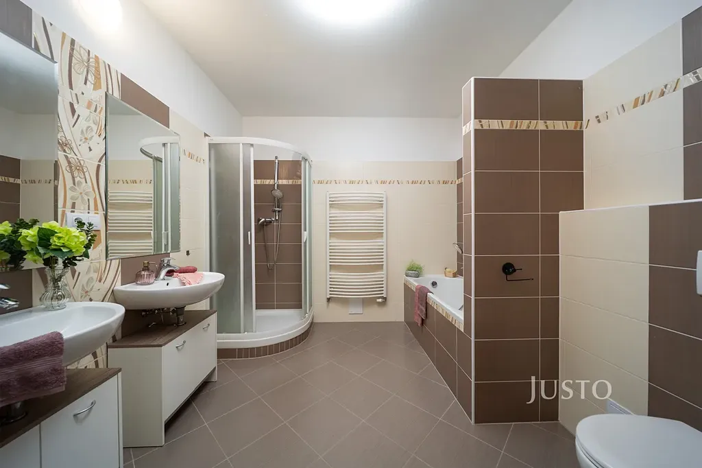 V patře najdeme čtyři samostatné pokoje: ložnici (14,82 m²) s balkonem a výhledem směrem k rybníku, dva pokoje orientované do zahrady (13,74 m² a 13,87 m²) a jeden pokoj (10,21 m²) do klidné ulice. K dispozici je také prostorná koupelna (9,65 m²) s vanou, sprchovým koutem i toaletou.