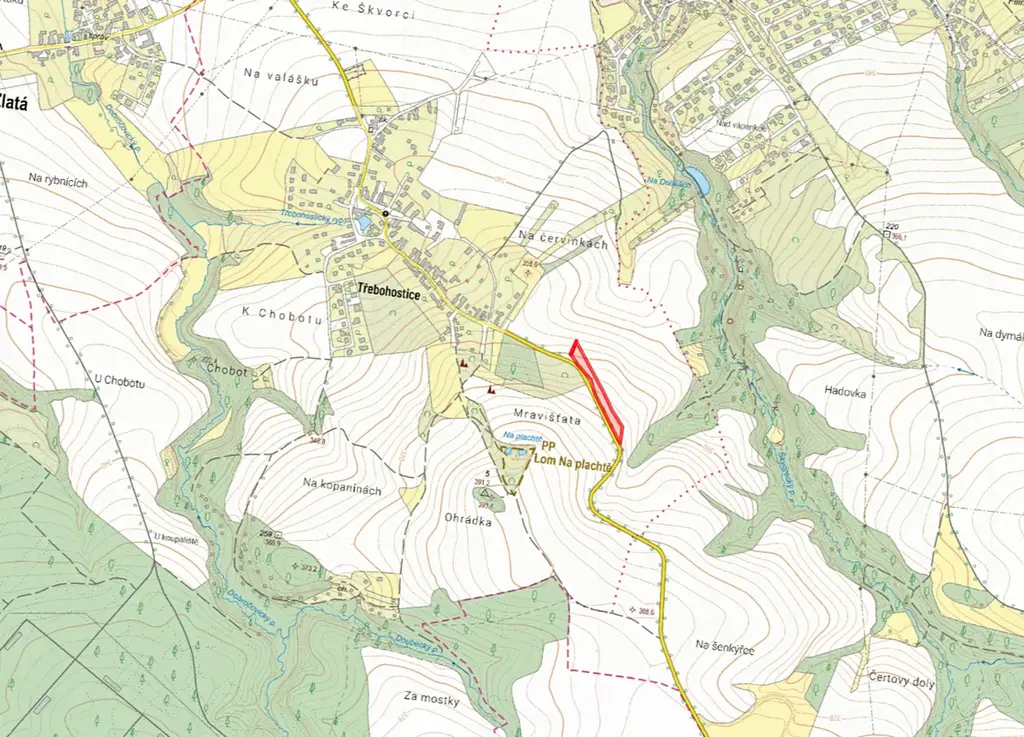 Pozemek leží v obci Třebohostice přímo u cesty. Poloha kombinuje skvělou dostupnost a soukromí - umístění na okraji stavebního území zaručuje klidný výhled do krajiny.