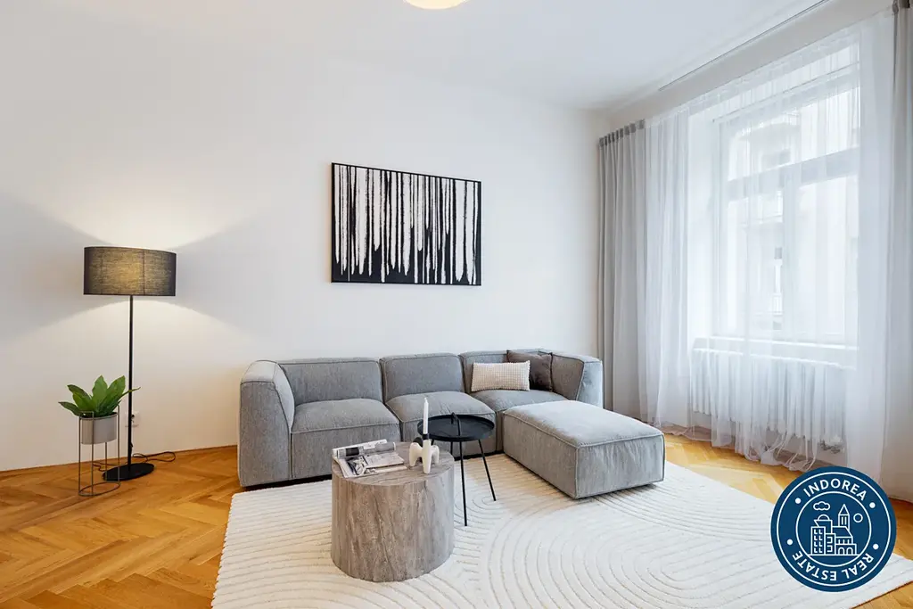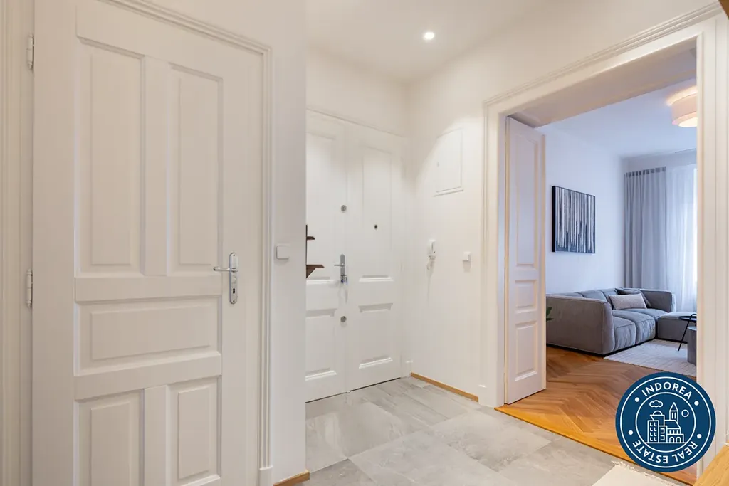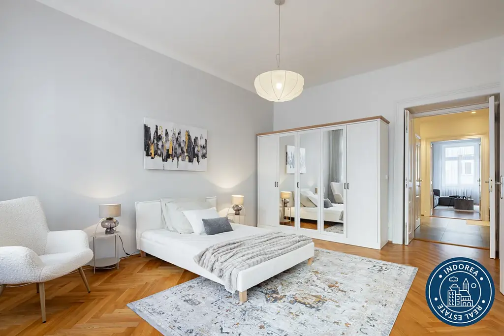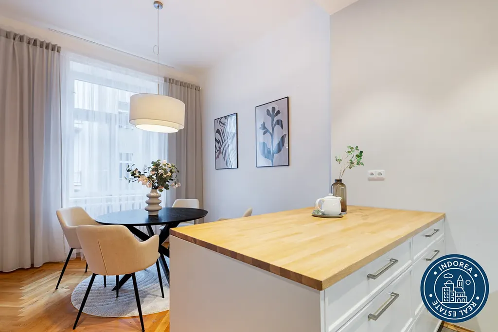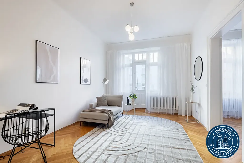 Byt prošel kompletní rekonstrukcí a nabízí vysoké stropy, dřevěné parketové podlahy, renovované křídlové dveře s původními prvky a promyšlené dispoziční řešení. K dispozici je prostorný obývací pokoj s kuchyňským koutem, moderní plně vybavená kuchyň Hanák se spotřebiči Electrolux, dvě samostatné ložnice, koupelna s vanou, dvě toalety, samostatná šatna, balkon a sklep.