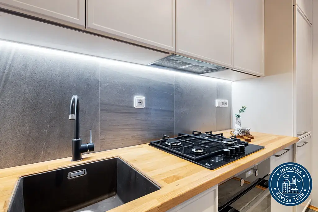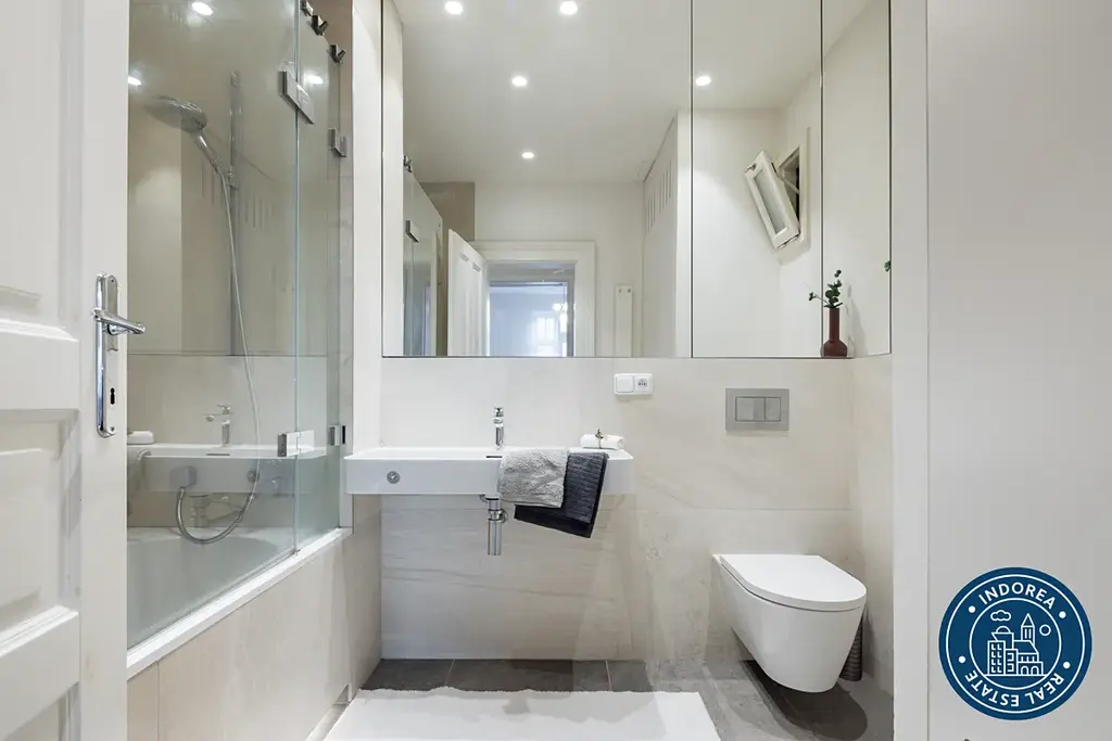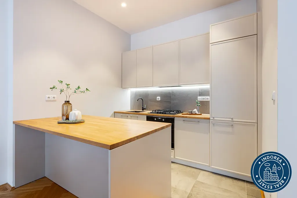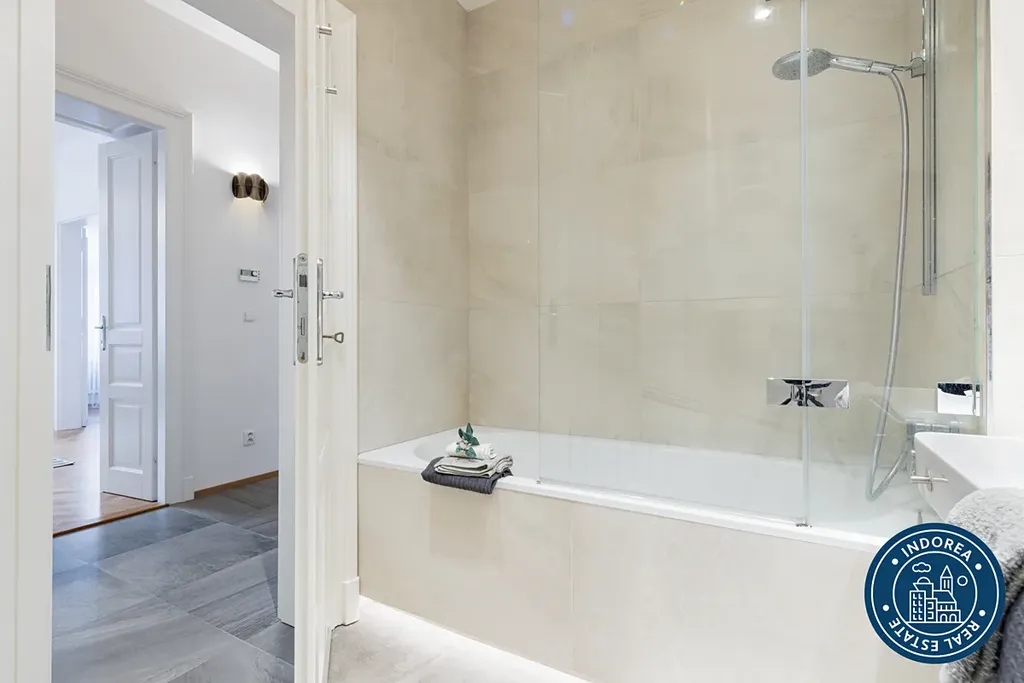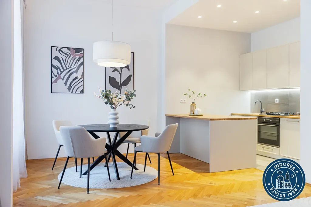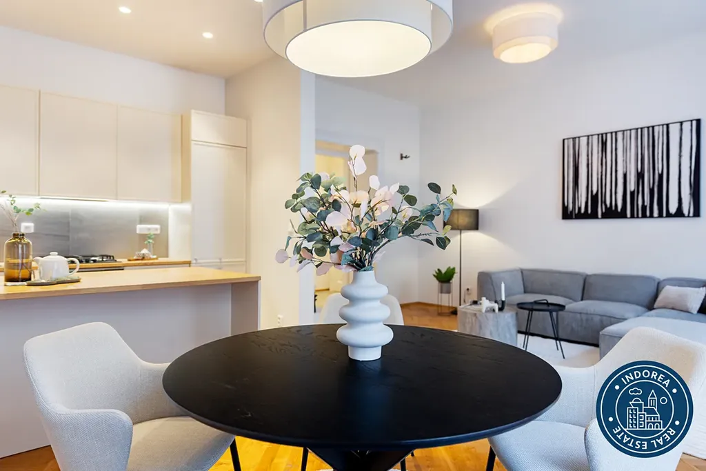 Byt prošel kompletní rekonstrukcí a nabízí vysoké stropy, dřevěné parketové podlahy, renovované křídlové dveře s původními prvky a promyšlené dispoziční řešení. K dispozici je prostorný obývací pokoj s kuchyňským koutem, moderní plně vybavená kuchyň Hanák se spotřebiči Electrolux, dvě samostatné ložnice, koupelna s vanou, dvě toalety, samostatná šatna, balkon a sklep.