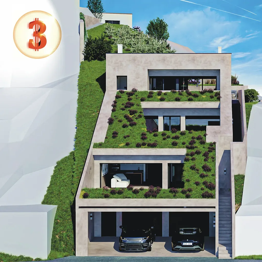 Tato impozantní skladba náročné výstavby ve stoupajícím terénu, částečně zasahující do zmíněného útesu, seskupuje celkem 4 efektní terasová podlaží s parkováním v suterénu až pro 4 vozidla. Vše samozřejmě s komfortním výtahem až do horní části komplexu.