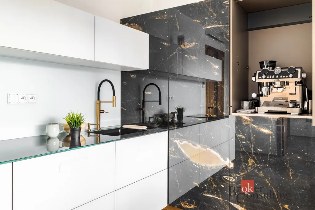 Interiér je kompletně zařízen prémiovým italským nábytkem značky Lago a kombinuje čisté linie s přírodními materiály. Dominantou obývací části je výrazná designová stěna, která prostoru dodává příjemnou atmosféru a podtrhuje jeho moderní a elegantní charakter. Ložnice je vybavena manželskou postelí a vestavěnými úložnými prostory. Vstupní část nabízí dostatek úložného prostoru a působí čistě i přehledně díky vestavěným prvkům a velkému zrcadlu.