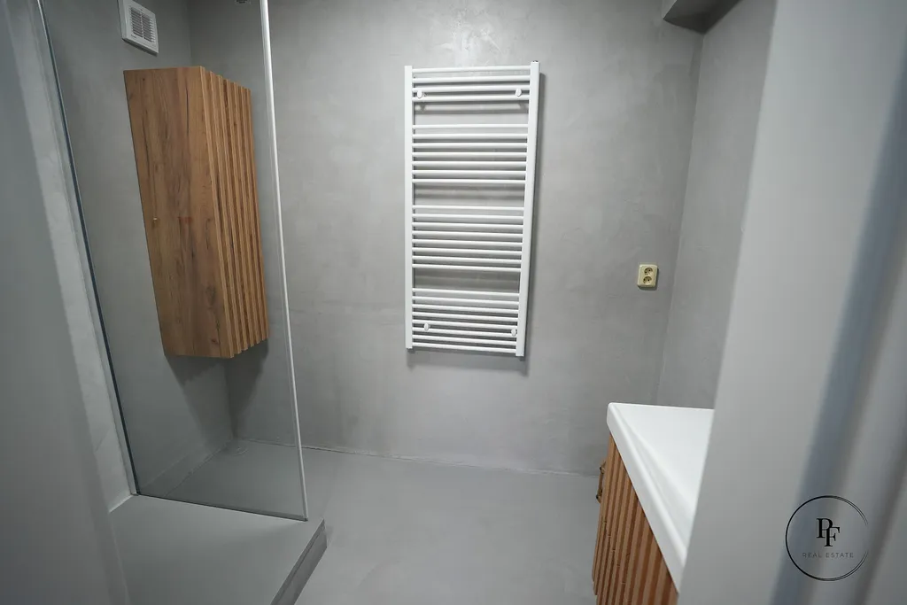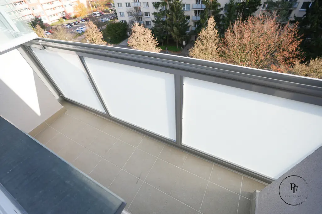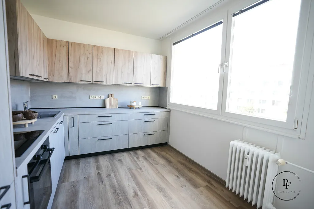Kuchyň je navržena v kombinaci betonové šedé a přírodního dřeva, má velkorysou pracovní plochu, vestavěnou varnou desku, troubu, digestoř a vysokou lednici. V koupelně je prostorný sprchový kout a celý prostor je moderně stylizovaný do betonové stěrky, která je velmi praktická na údržbu a zároveň působí elegantně a nadčasově. Doplňuje ji designová dřevěná skříňka pod umyvadlem a bílé žebříkové topné těleso. Z obývacího pokoje je vstup na zasklenou lodžii s příjemným výhledem do okolní zástavby a zeleně. K bytu patří také sklep.