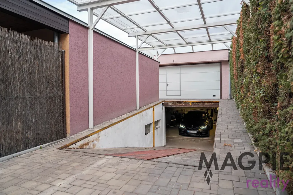 K domu patří udržovaná zahrada s biotopem o rozloze 290 m² a menší předzahrádka. Významným benefitem je mimořádné parkovací zázemí – dvoupodlažní garáž o rozloze 87 m², která díky hydraulické rampě umožňuje parkování čtyř vozů přímo v garáži. Další zastřešené stání a možnost parkování vozu na pozemku zajišťují celkovou kapacitu až pěti automobilů.
