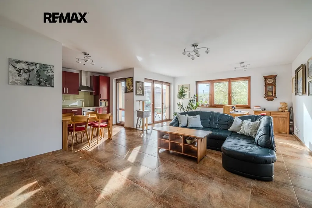 Světlý a útulný prostor s francouzským oknem přímo na žulovou terasu a k vyhřívanému bazénu.