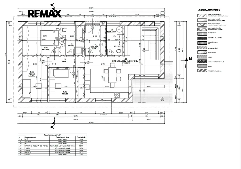 Prostorný obývací pokoj s jídelnou a kuchyní (38,51 m²) – s přímým vstupem na terasu a možností napojení na venkovní kryté posezení.