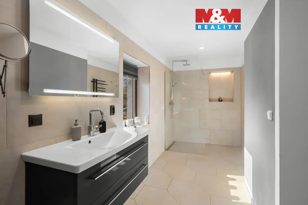 Díky umístění domu ve svahu je suterén přirozeně přístupný ze zahrady a nabízí široké možnosti využití. Najdete zde další obytný pokoj i prostornou místnost vhodnou jako posilovna, pracovna, herna nebo zázemí pro podnikání. Nechybí ani sauna pro relaxaci a dostatek úložných prostor.