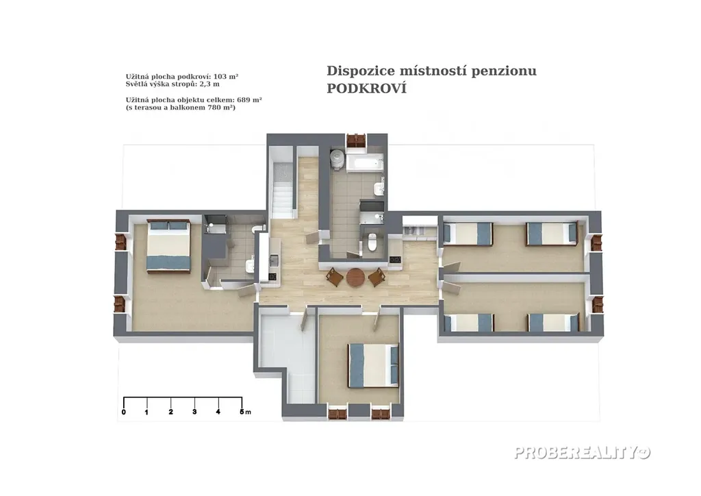 Užitná plocha: 689 m2 (2 nadzemní podlaží + podkroví), s terasou a balkonem 780 m2