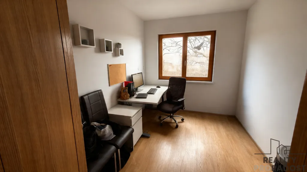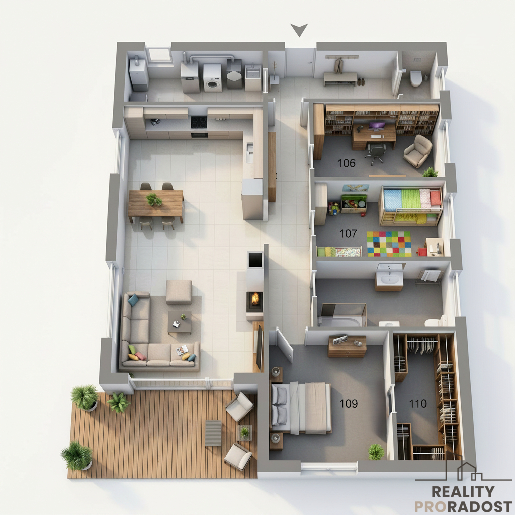 • Srdcem domu je obývací pokoj s kuchyní (37 m²). K dispozici je dále ložnice s vlastní šatnou, pokoj, pracovna, koupelna a technická místnost.