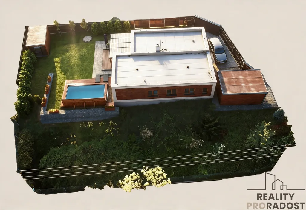 • Součástí je venkovní bazén 20 m2, zahradní domek 12 m2, samostatná garáž (24 m²) a parkování pro další dva vozy.