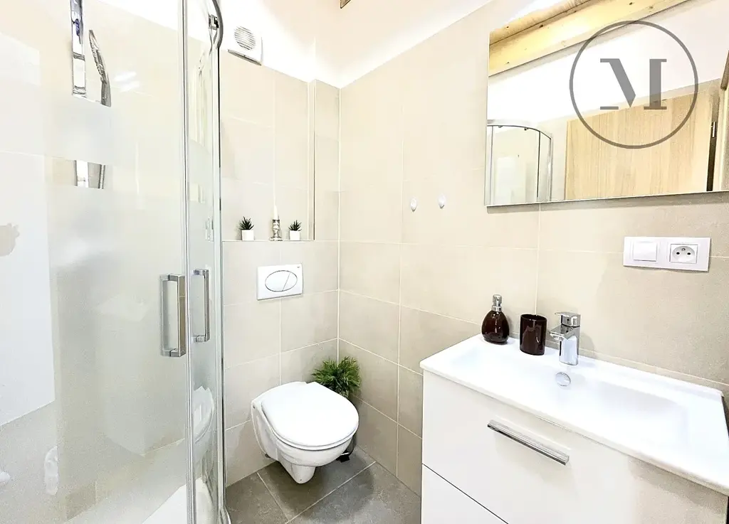 V přízemí se nachází prostorný a vzdušný obývací pokoj s celoprosklenou stěnou, která umožňuje nepřetržitý výhled na jezero. Posuvná stěna poskytuje přímý vstup na velkorysou terasu o ploše 15 m², ideální pro relaxaci a chvíle pohody. Na obývací pokoj plynule navazuje moderní kuchyňský kout, který je plně vybaven kvalitními spotřebiči: indukční varnou deskou, digestoří, pečící troubou, vestavěnou lednicí, myčkou a mikrovlnnou troubou. V přízemí se dále nachází samostatná ložnice, koupelna s toaletou a prostorná předsíň.