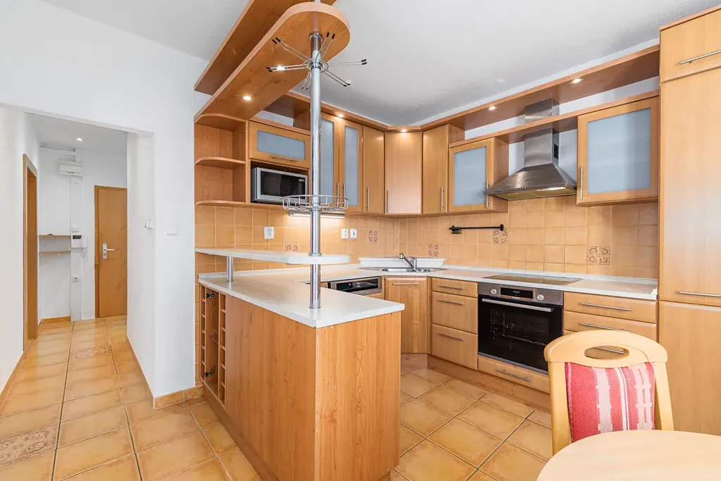 Dispozice 3 + 1, celkové výměra 69 m² ( včetně balkonu a dvou sklepů ). Byt se nachází v 1. patře panelového domu s výtahem na adrese Povážská 291, Přední Ptákovice. Je částečně zařízen, s prostornou kuchyňskou linkou i spotřebiči, které jsou součástí prodeje. Vestavěná skříň v jednom z pokojů je praktickým úložným prostorem, který oceníte hned po nastěhování, stejně tak i praktickou technickou místnost ( komoru ) v předsíni.