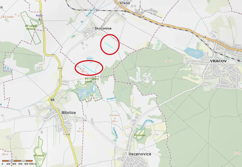 Pozemky jsou situovány jižně od obce Skoronice.