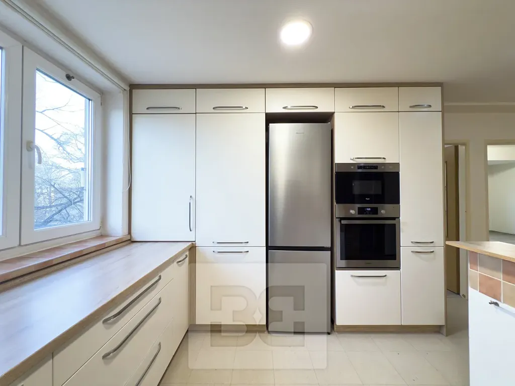 Byt je vybaven moderní prostornou kuchyňskou linkou se spotřebiči (lednice s mrazákem, indukční deska, trouba, digestoř, myčka).
