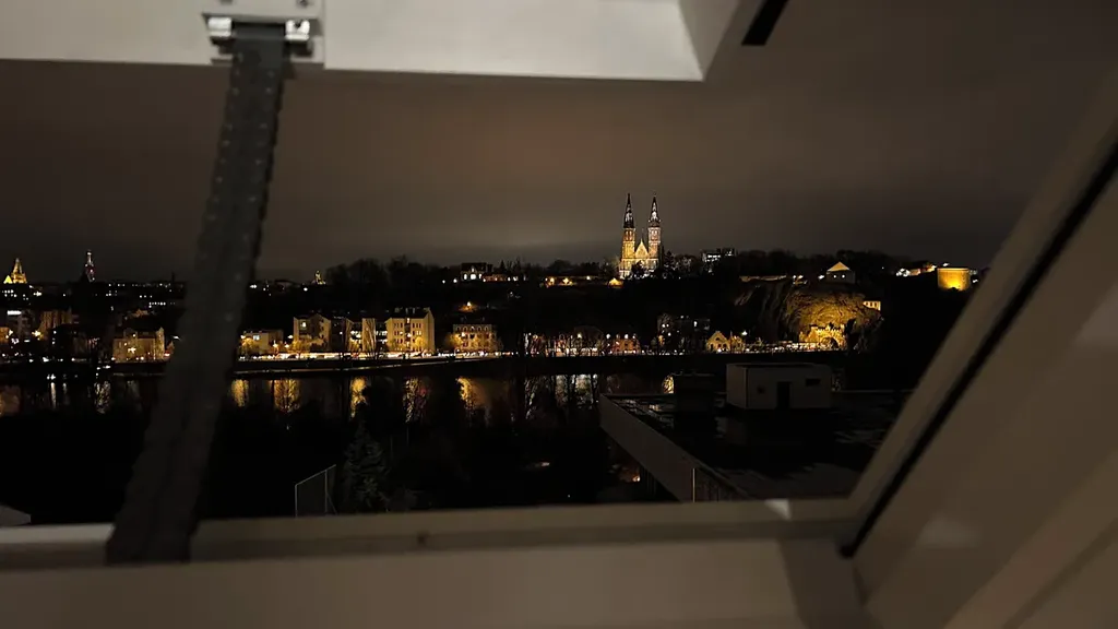 Díky velkým ateliérovým oknům je interiér krásně prosvětlený a nabízí nádherné panoramatické výhledy na Prahu. Tyto prvky podtrhují otevřenost a jedinečný charakter celého prostoru.