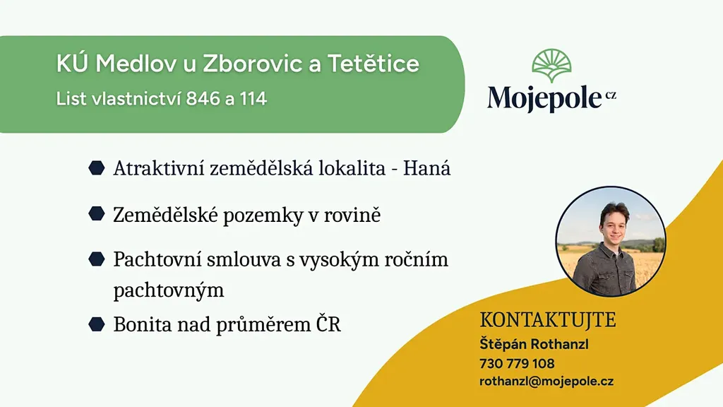V katastrálních územích Tetětice a Medlov u Zborovic, okres Kroměříž, nabízíme k prodeji soubor pozemků ve výlučném vlastnictví o celkové výměře 34 319 m².