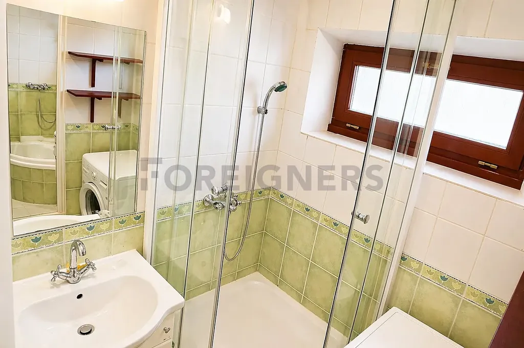 V koupelně se nachází sprchový kout, umyvadlo a pračka. Toaleta je oddělena.
