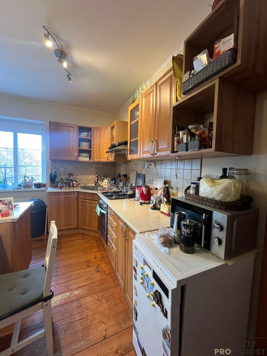 Dispozice 2+1 – praktické rozdělení prostoru na 70,7 m² poskytuje velkorysý komfort pro bydlení. Kuchyň vybavená spotřebiči, koupelna (s oknem) a vanou, samostatné WC, komora / šatna. K bytu náleží dvě sklepní kóje v suterénu domu o ploše celkem 9 m2 a podíl na společné zahradě 109 m2.
