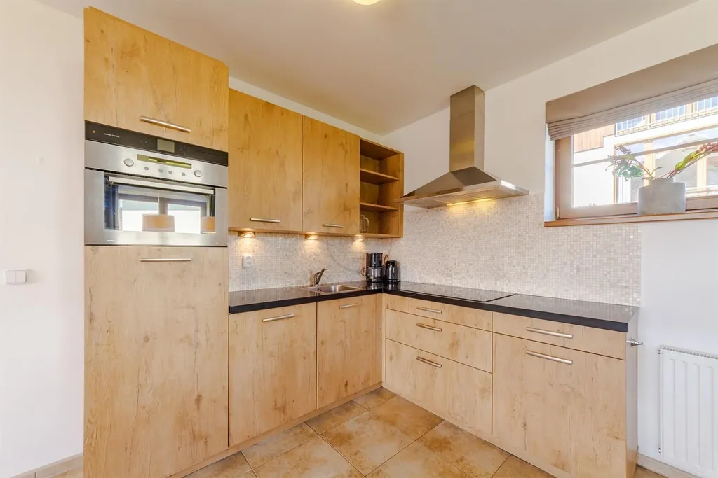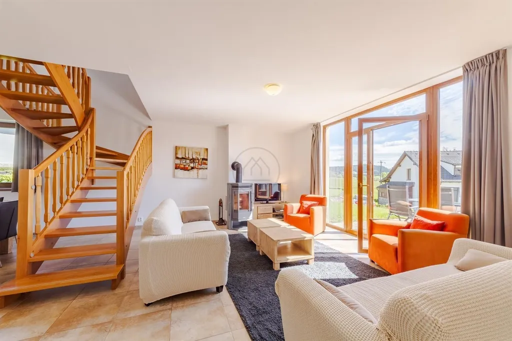 Díky velkým oknům a orientaci na jih je v interiéru spoustu světla, prostor působí velice otevřeně a útulně. V ceně je kompletní vybavení, nábytek a elektrospotřebiče, dále k dispozici vyhrazené parkovací stání. Dům má inteligentní vytápění, které se ovládá telefonem. Výhodou jsou krbová kamna, vinylové podlahy, obložené sokly pohledovým kamenem a dřevěné obložení štítu. Na zahradě je také zahradní domek a sklad.