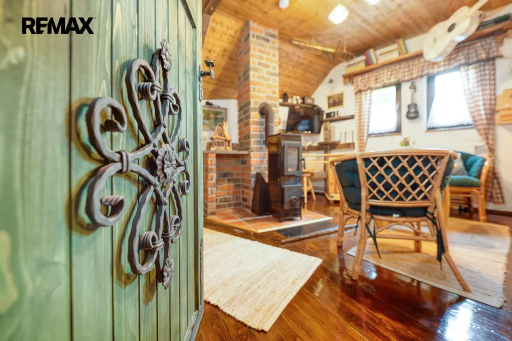 Vstupní chodba s přístupem do místnosti aktuálně využívané jako keramická dílna a schodištěm do horních podlaží. V dalším podlaží se nachází pokoj a průchod do druhé části domu. V podkroví se nachází prostorný byt se dvěma pokoji, kuchyňským koutem, jídelní částí, obývacím prostorem a koupelnou.