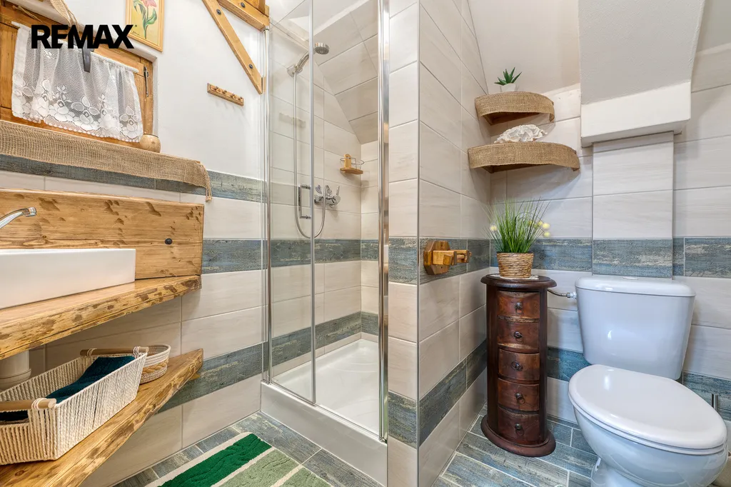 Dost místa pro vícegenerační bydlení. V domě jsou tři koupelny, podkrovní část domu nabízí téměř 100 m² obytné plochy, navržené s důrazem na komfort a kvalitu.