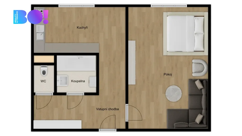 Vnitřní prostor je dostatečně prostorný pro příjemné bydlení. Dominantou bytu je jeho světlost a útulná atmosféra, ideální pro jednotlivce nebo pár. Byt se pronajímá bez vybavení.