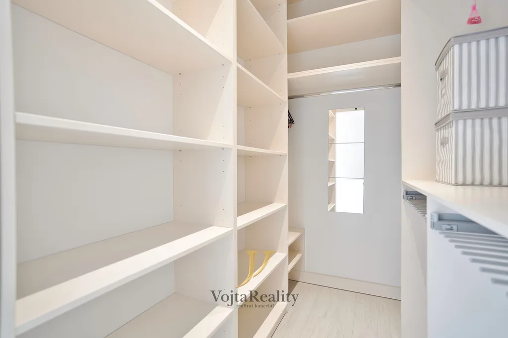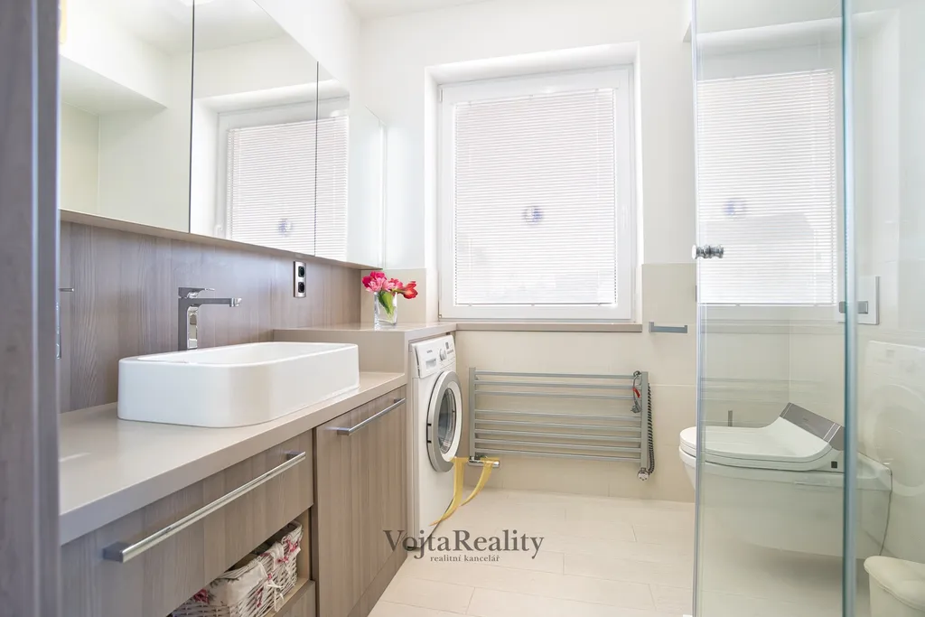 Vysoký standard podtrhují vinylové podlahy a kombinované vytápění – klasické radiátory doplňuje podlahové teplovodní topení v koupelně, chodbě a části obývacího pokoje. Koupelna je vybavena značkovou sanitou, prostorným sprchovým koutem a moderní sprchovací toaletou s nahřívacím prkénkem.