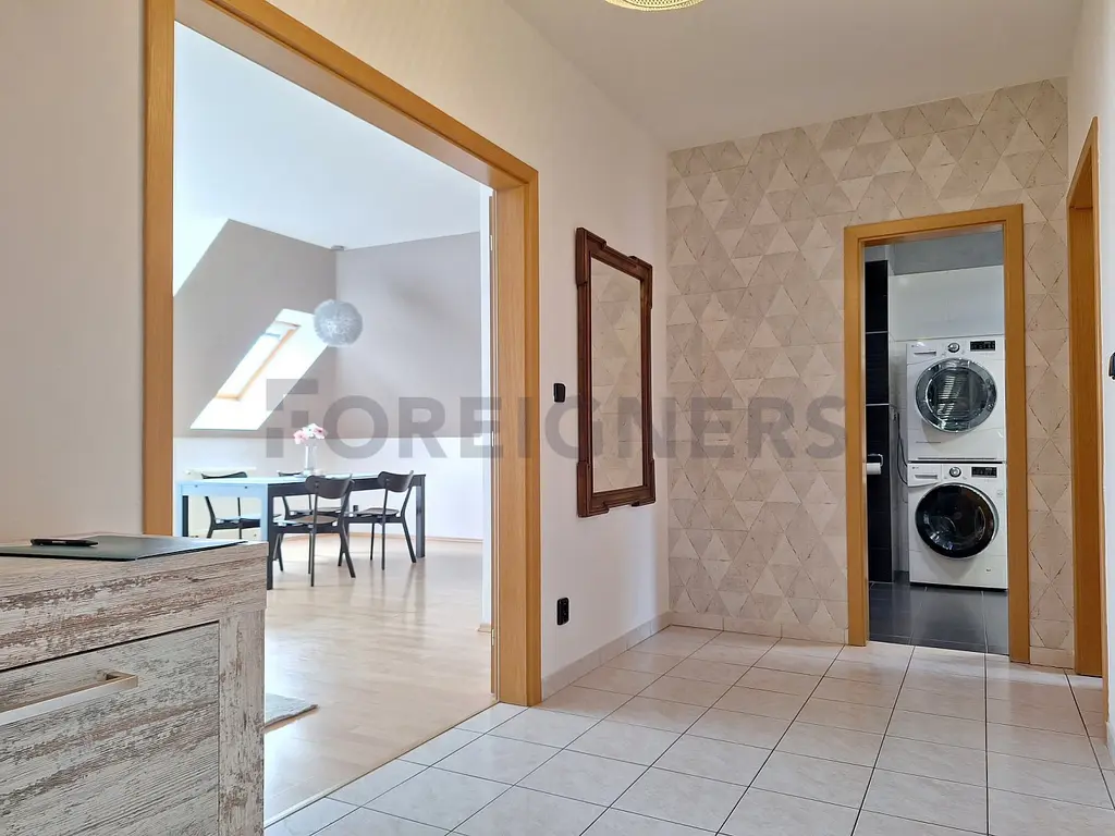 Byt se nabízí kompletně vybavený. Stylová kuchyně disponuje všemi spotřebičemi - lednicí, myčkou, elektrickou troubou, varnou deskou a digestoří. V kuchyni najdete i jídelní stůl se čtyřmi židlemi.