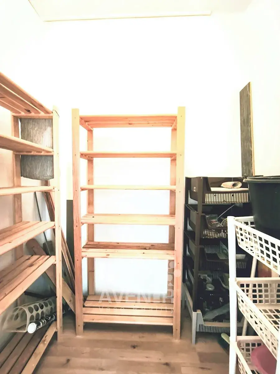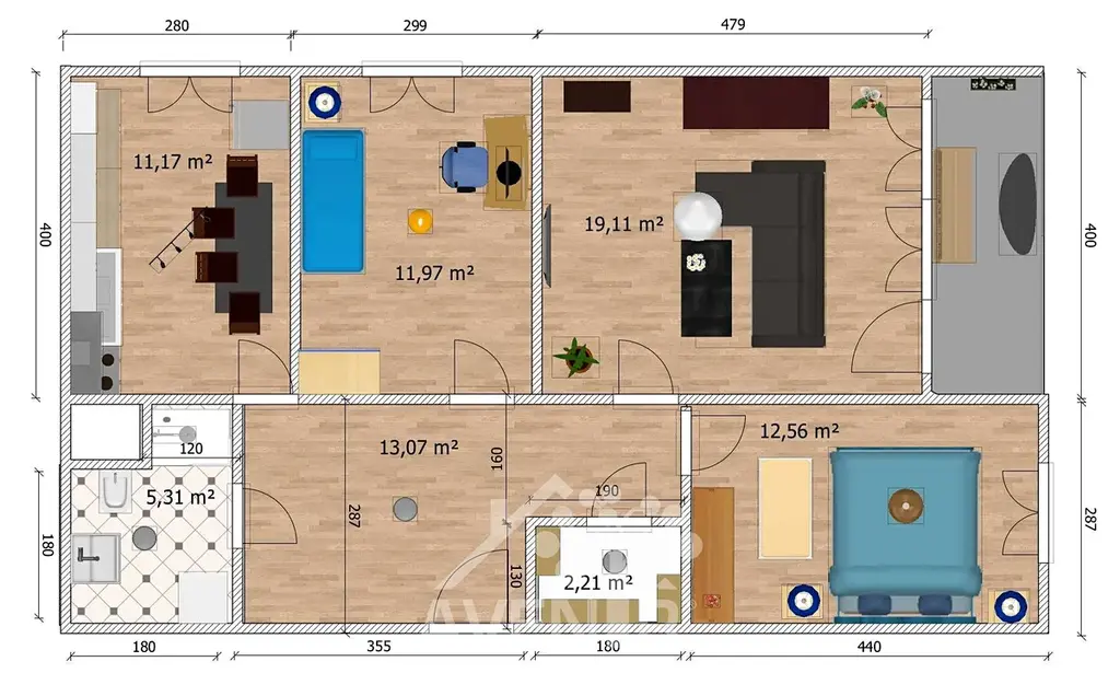 Skládá se z obývacího pokoje (19 m2) s lodžií, kuchyně (11 m2), ložnice (12,5 m2), dětského pokoje (12 m2), koupelny se sprchovým koutem a wc (5,3 m2), komory (2,2 m2) a chodby (13 m2) a sklepní kóje.