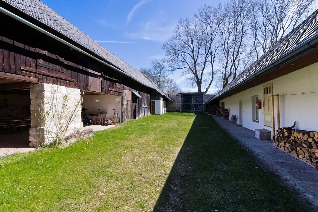 Dvůr uzavírá velká stodola. V její přední části se nachází kryté venkovní posezení ideální pro setkávání s rodinou a přáteli, doplněné o venkovní WC a sprchu. Zadní část stodoly je využívána jako garáž, aktuálně sloužící jako herna. Pod stodolou se nachází menší klenutý sklep.