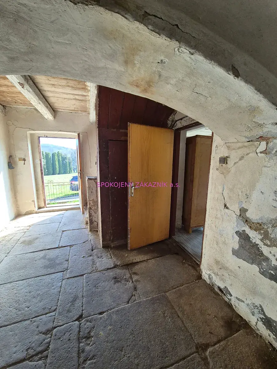 V přízemí domu je prostorná chodba s tradiční pecí, která byla dříve využívána pro pečení chleba a přípravu pokrmů při domácích zabíjačkách. Pec představuje autentickou součást zemědělského hospodářství. Dále se zde nachází ložnice s umyvadlem, kuchyň s kachlovými kamny, obývací pokoj a v zadní části je místnost s vanou, suché WC, chlévy a garáž s dílnou. Po dřevěných schodech se dostaneme do podkroví, které nabízí ideální předpoklad pro modernizaci a přestavbu na obytné prostory dle vlastních představ.