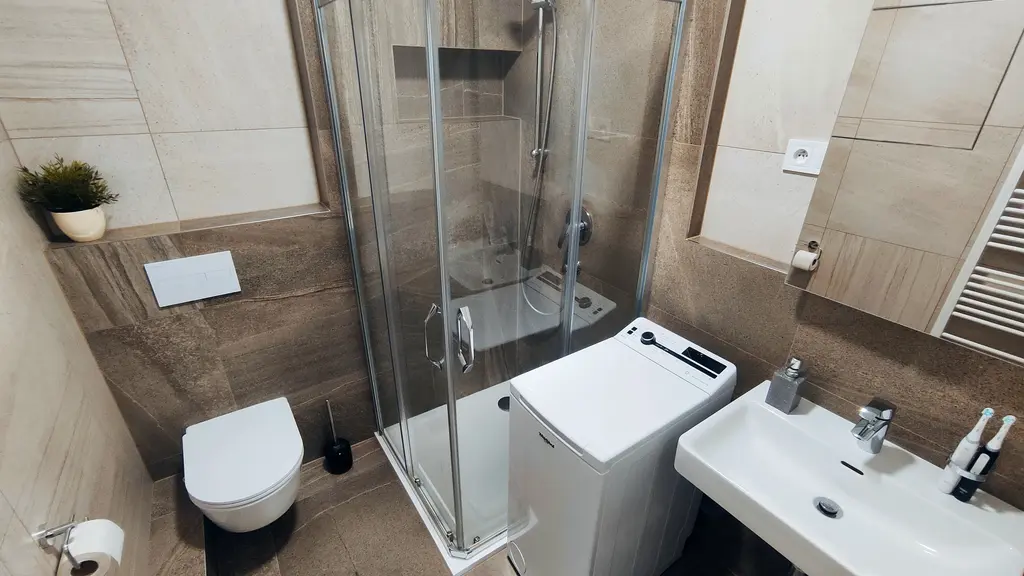 Byt je částečně vybaven, a to kuchyňskou linkou s vestavnou horkovzdušnou troubou, mikrovlnou troubu, vestavnou lednicí s mrazícím boxem, indukční varnou deskou, digestoří, myčkou nádobí a jídelním stolem se dvěma židlemi. Koupelna je vybavena prostorným sprchovým koutem, WC, umyvadlem se zrcadlem a pračkou s horním plněním. V chodbě je možné připojit sušičku prádla. Součástí bytu je i balkón o výměře cca 5 m², který je stejně jako okna orientován do vnitrobloku. V bytě je podlahové teplovodní vytápění, které v kombinaci s nízkou energetickou náročností budovy zajišťuje nízké provozní náklady. Přepis el. energie se na nájemce.