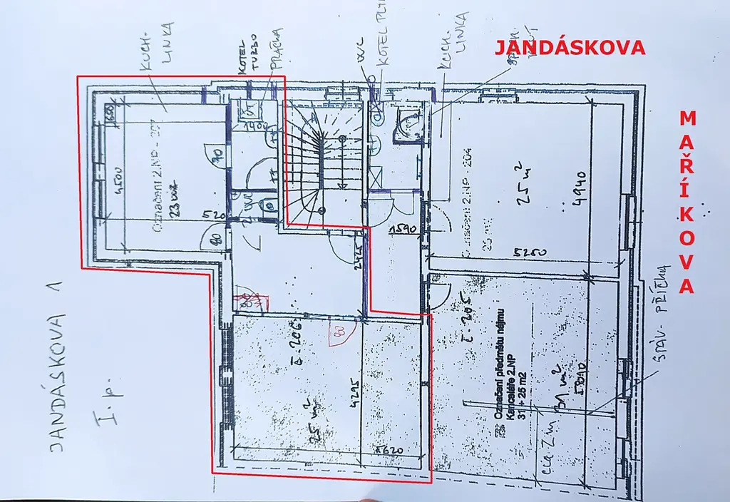 Pronájem zrekonstruovaného bytu o dispozici 2+kk na ulici Jandáskova (roh Jandáskova x Maříkova). Byt se nachází v 1. patře zateplené cihlové budovy bez výtahu. Celková plocha bytu činí 60m2. Koupelna se sprchovým koutem, toaleta s umývadlem odděleně, dále pokoj o velikosti 25m2, obytná kuchyň s kuchyňským koutem (23m2) a velká hala s komorou. Celý byt prošel před pěti lety kompletní rekonstrukcí,.. instalována kuchyňská linka, s vestavnou troubou, plynovými hořáky, digestoří a myčkou, dále nevybaveno. Podlahy (PVC a dlažba), LED svítidla, a mnohé další. Vytápění pomocí kombinovaného plynového kotle, který je propojen s termostatem (úspornější varianta vytápění). Velkou výhodou bytu je vyhrazené parkovací stání přímo u domu (1 000 Kč/měsíc. Cena pronájmu činí 17 000 Kč + 500 Kč/os. + zálohy na energie a služby (cca 2 500 Kč) + parkovací stání 1 000 Kč. Celkem tedy 21 000 Kč včetně energií, služeb a parkovacího stání. Volné od 1.7.2026. V případě zájmu o prohlídku kontaktujte telefonicky nebo do emailu uvádějte prosím telefon (snadnější komunikace). Na dotazy bez telefonu nebude odpovězeno. RK
