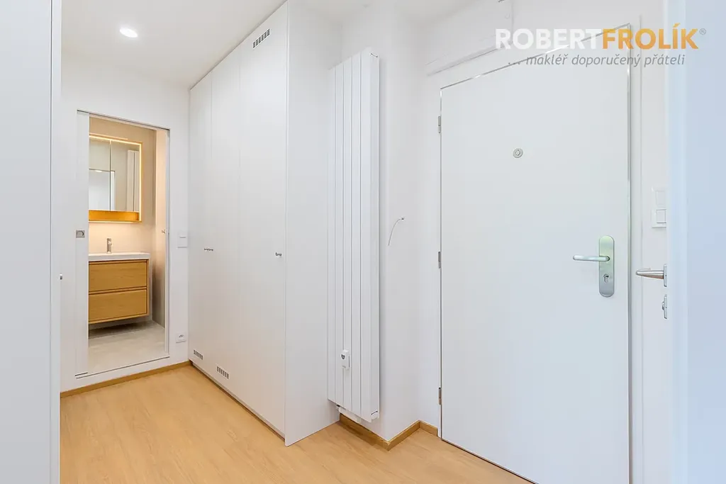 V bytě je využitý každý kousek plochy. Kuchyňský kout v sobě skrývá vestavěné spotřebiče (indukční varná deska, elektrická trouba, digestoř, myčka, lednice s mrazákem). Před kuchyní je místo na malý gauč a TV, u francouzského okna na jídelní stolek, případně i s osvětlením nad ním. V ložnici je šatní skříň ve zdi. Další velké skříně jsou v chodbě. V jedné z nich se skrývá i elektrický bojler na ohřev teplé vody. Topení je v domě centrální, z plynové kotelny v suterénu. Radiátory budete mít i v chodbě a koupelně. Koupelna má okno do velkého světlíku, takže byt se dá krásně větrat. Prádlo si usušíte v sušičce. Vstupní dveře do bytu jsou bezpečnostní, okna plastová s dvojskly a žaluziemi. V suterénu domu budete mít i sklípek a vedle domu pěkné společné posezení.
