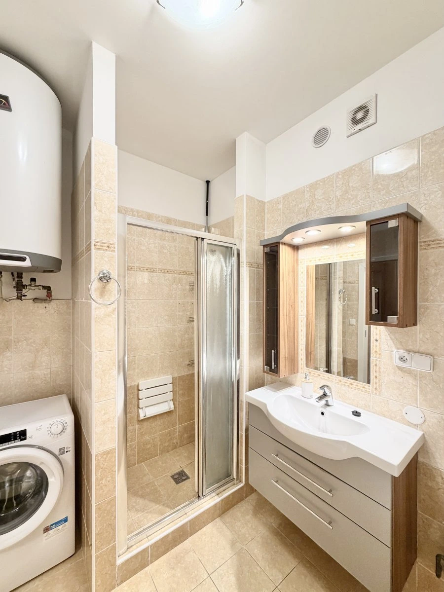 Byt se nabízí částečně vybavený. Kuchyně disponuje myčkou, elektrickou troubou, varnou deskou, mikrovlnnou troubou a digestoří. Obývací část a ložnice je bez vybavení. V druhém pokoji najdeme dvě šatní skříně. V koupelně je vana i sprchový kout, umyvadlo a pračka. Toaleta je umístěna samostatně. V bytě je také komora jako další úložný prostor.