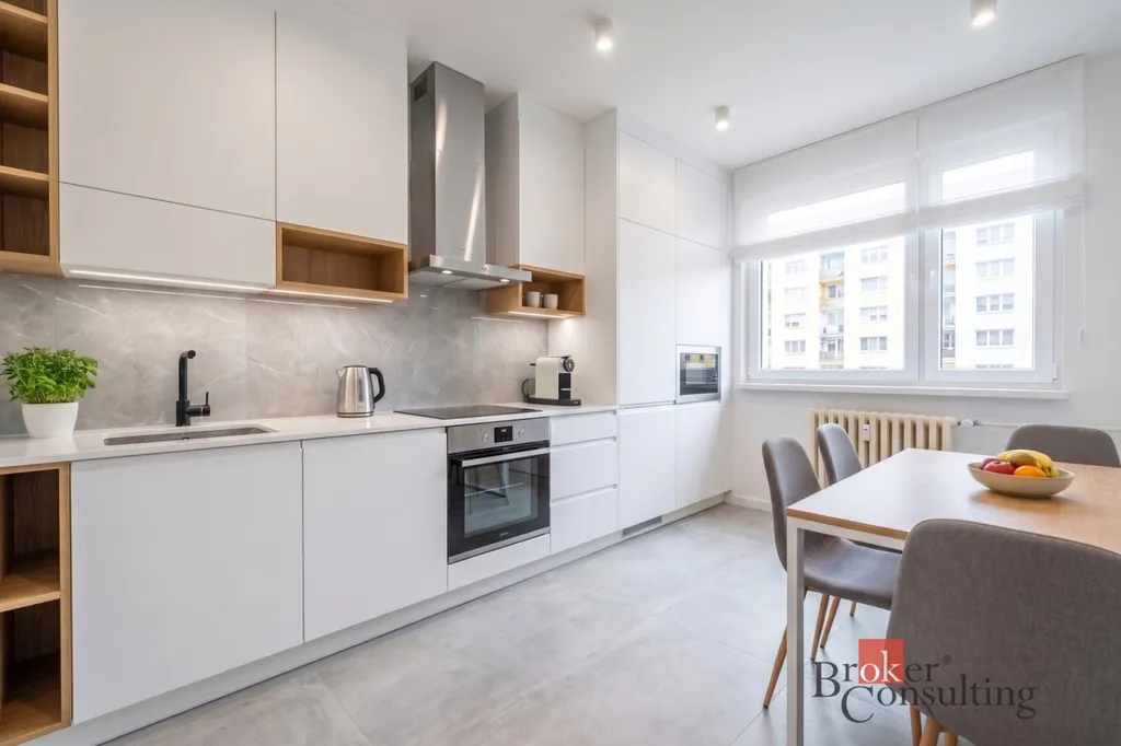 Interiér bytu tvoří tři samostatné pokoje, kuchyň a neobvykle prostorná chodba, která dává celému prostoru vzdušnost. Velkou výhodou je samostatná komora přímo v bytě, kterou lze využít jako šatnu nebo skladovací prostor, čímž odpadá nutnost řešit úložné prostory v obytných místnostech. Koupelna a toaleta jsou oddělené. Z obývacího pokoje je vstup na lodžii orientovanou do vnitrobloku mezi okolní zástavbu. K bytu samozřejmě náleží také sklepní kóje.