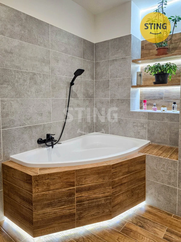 Velkorysá je zejména koupelna, která je nadstandardně veliká a nabízí jak rodovou vanu s podsvětlením, tak také komfortní sprchovací kout, závěsné WC, otopný žebřík, umyvadlo se skříňkou a dostatek místa pro prádelní koš a pračku. Dlažba a keramické obklady jsou v přírodním dekoru.