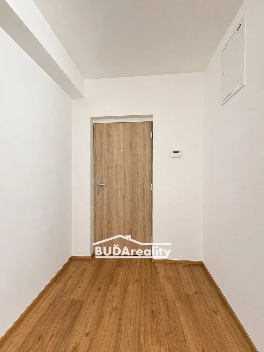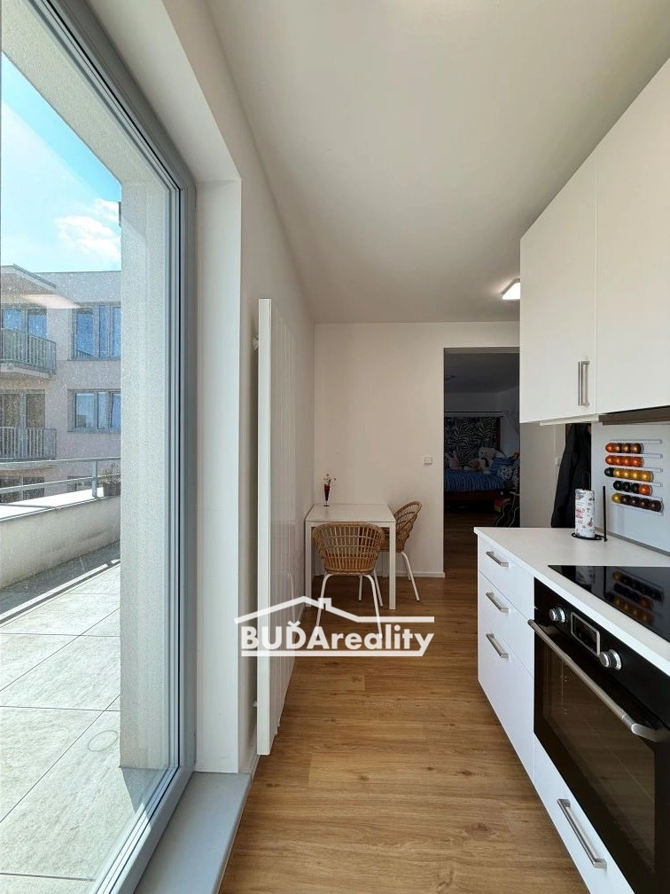 K bytu v 3. NP Vás vyveze výtah. Do bytu se vchází vstupní chodbou. Součástí bytu je dále koupelna se sprchovým koutem a wc, obývací pokoj se vstupem do prostorné terasy. Samostatnou místností je kuchyň s moderní kuchyňskou linkou, kde jsou k dispozici vestavěné spotřebiče – myčka, lednice s mrazícím boxem, mikrovlnná trouba, trouba, sklokeramická deska a digestoř).