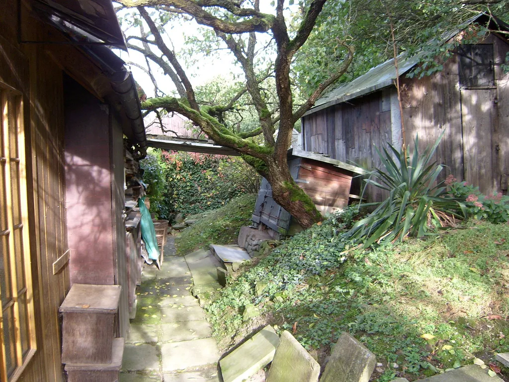 Zahrada je udržovaná, se vzrostlými okrasnými a ovocnými stromy, a příjezd automobilem je možný až na pozemek.