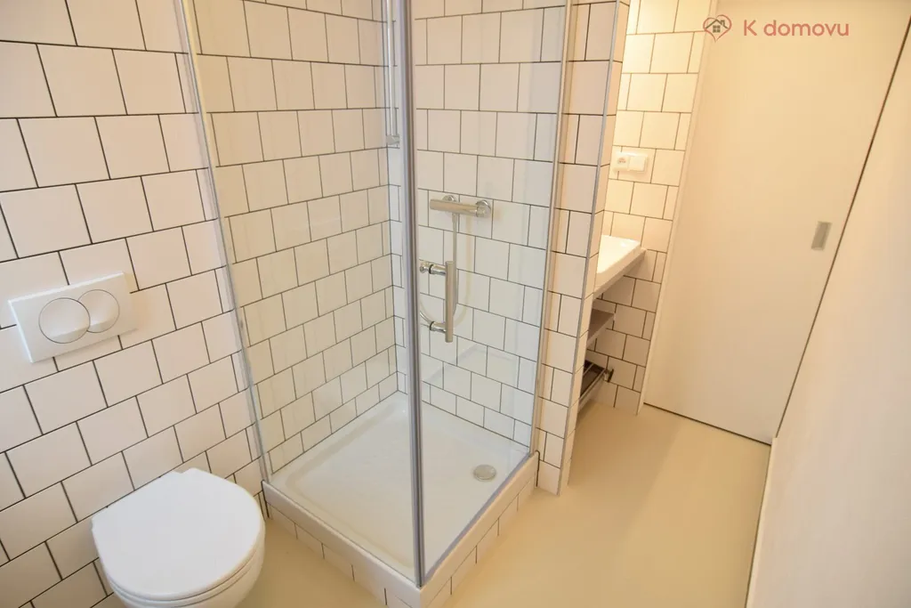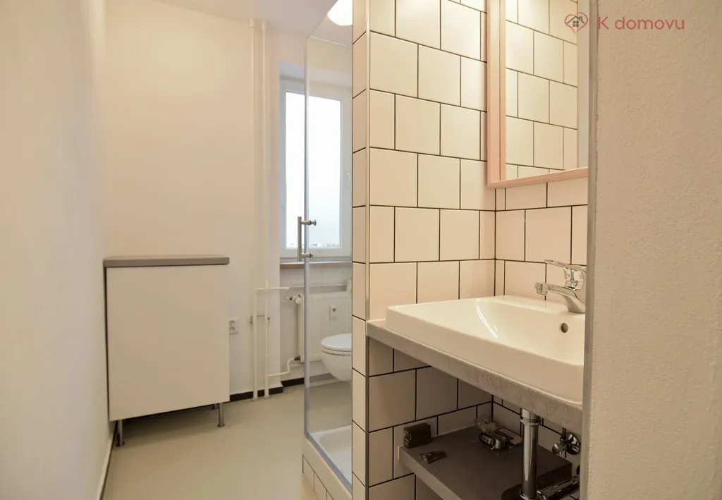 • Koupelna se sprchovým koutem, umyvadlovou skříňkou se zrcadlem a přípojkou na automatickou pračku.