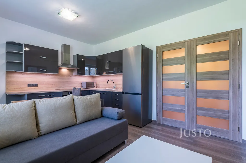 Kuchyně: Kuchyňská linka s vestavěnými elektrospotřebiči značky Gorenje (indukční varná deska, elektrická trouba a digestoř), mikrovlnná trouba značky Beko a lednice s mrazákem značky Gorenje. V kuchyni je také jídelní stůl, dvě židle, sedací souprava, konferenční stolek, stolek pod televizí a televize JVC.